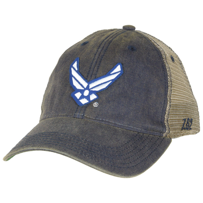 Embroidered USAF Logo on a vintage style trucker cap with softened mesh to keep your head happy. Snap back, one-size-fits-most.
