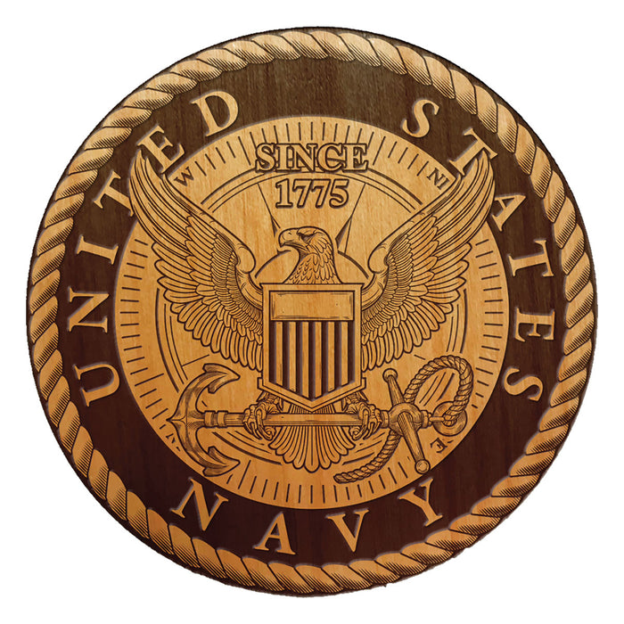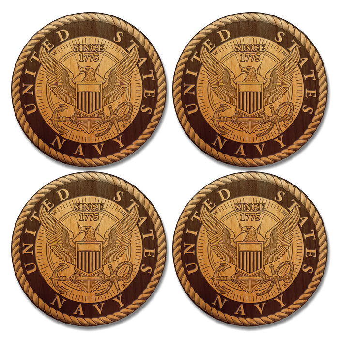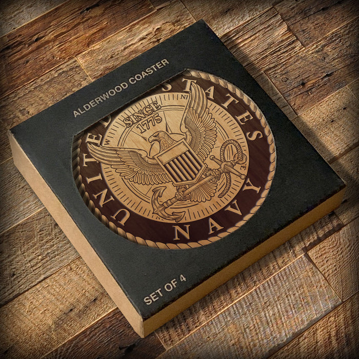 This round coaster set produced from alder wood, laser etched with the logos of the United States Navy. It's a great addition to any Sailor's collection!