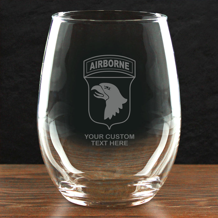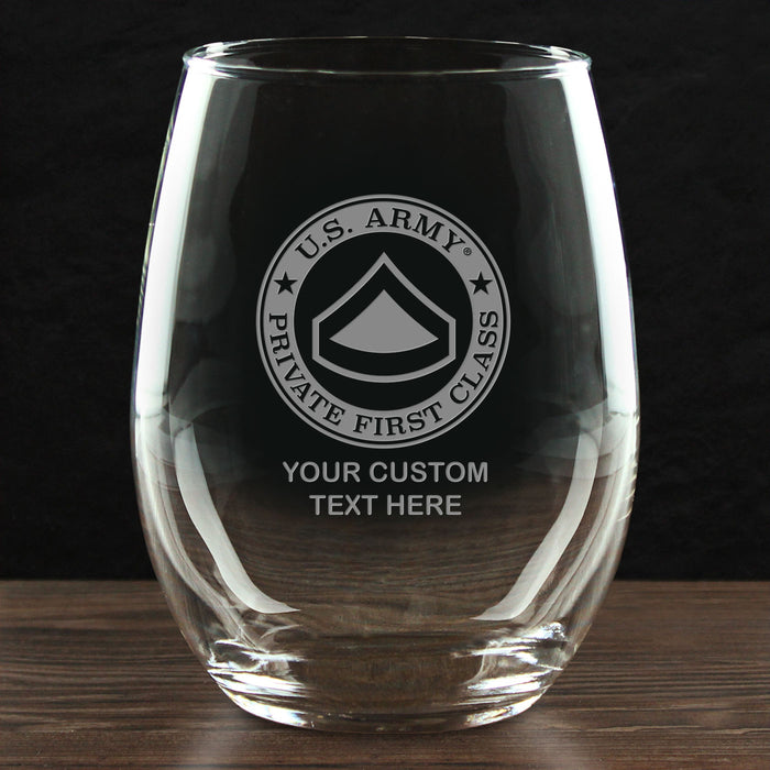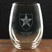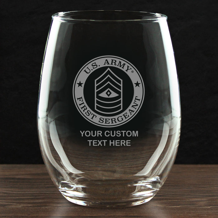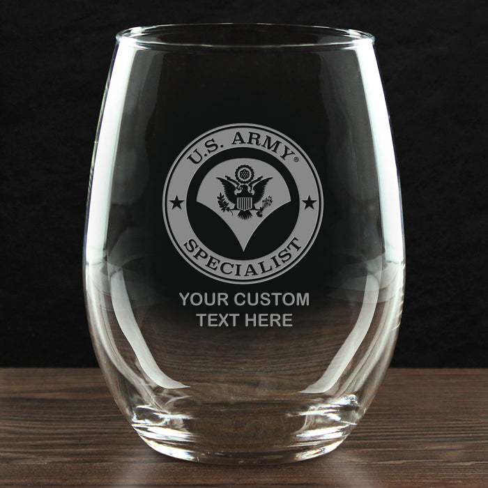 Show off your US Army pride with this personalized 21 oz stemless wine glass. Each glass is made in the USA and etched by hand, making for a truly unique item. Add a name, rank, or meaningful message to make it even more special. Perfect for all active duty soldiers and veterans.